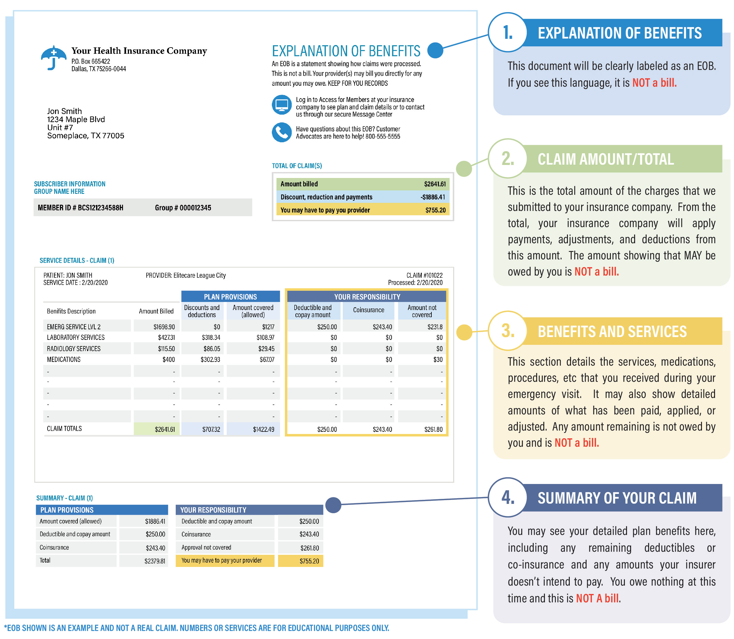 You may receive an Explanation of Benefits (EOB) from your insurance company shortly after your emergency visit. We want you to understand one very important fact that will be reiterated throughout this page. An EOB is NOT a bill. Do not be concerned, do not worry… you do not owe anything at this time and you will NOT owe ANYTHING until you receive a bill from us -and it will be clearly labeled as such.