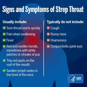 “Worried Your Sore Throat May Be Strep?” Centers for Disease Control and Prevention, Centers for Disease Control and Prevention, 1 Nov. 2018, https://www.cdc.gov/groupastrep/diseases-public/strep-throat.html.